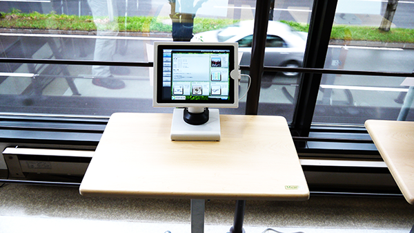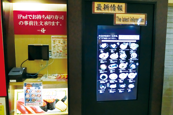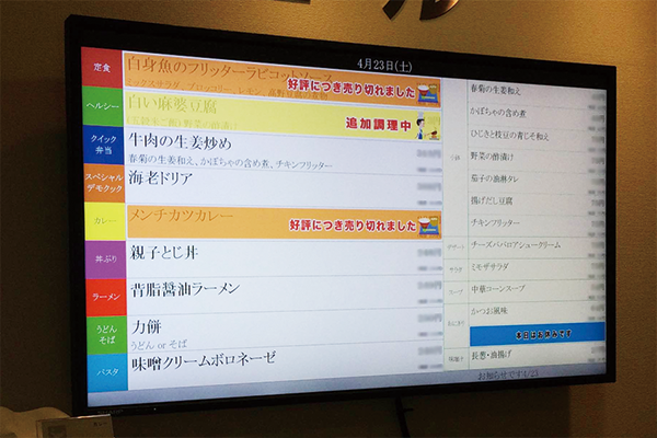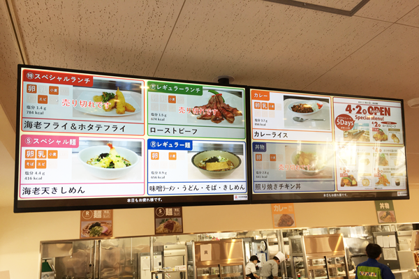 そこで、食堂の入口に、メニューの販売状況を表示したディスプレイを設置し、食堂の中からタブレット端末を操作することで、
