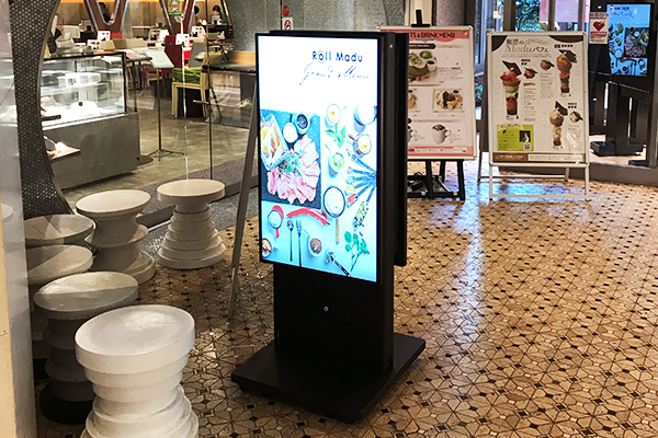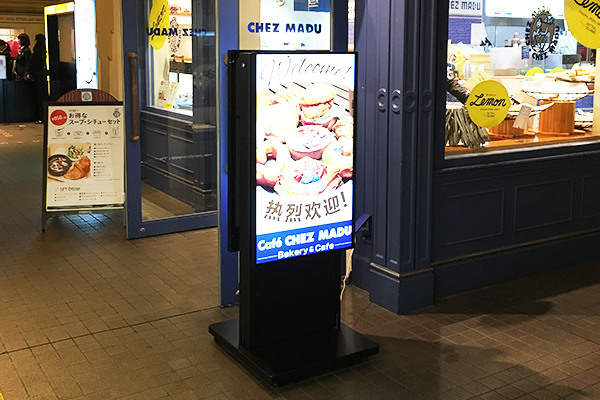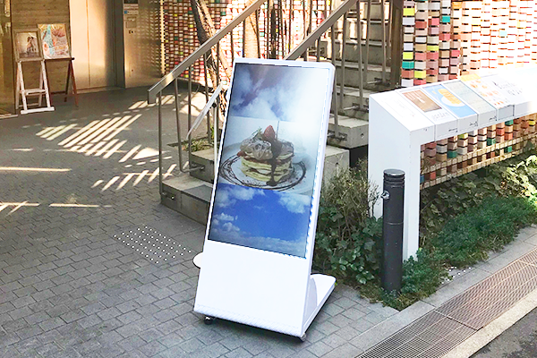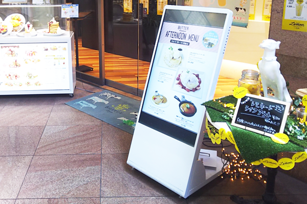 静止画はもちろん、動画により効果的に店舗のプロモーションを行なうことができるサイネージになります。コンテンツ更新はWi-Fiを使い、インターネットでの更新を実現しております。