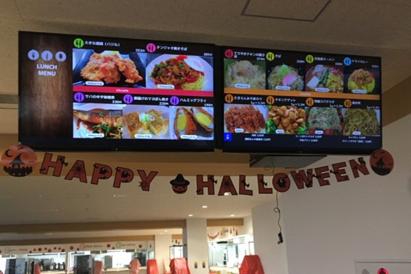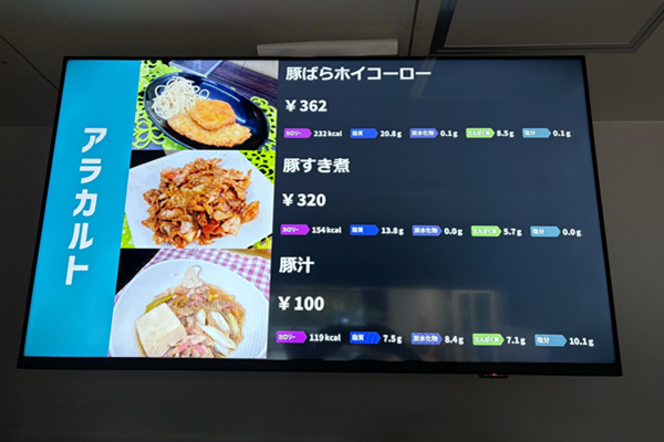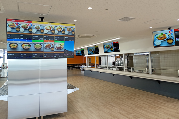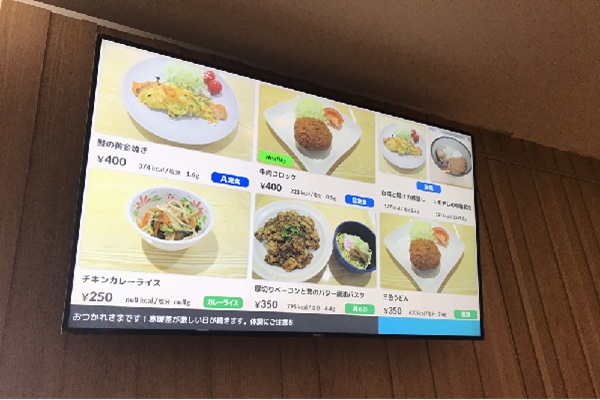 そこで、食堂の入口に、メニューの販売状況を表示したディスプレイを設置し、食堂の中からタブレット端末を操作することで、